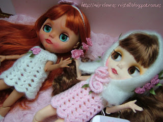 Pero no acaba ahí la cosa,no ,no que va....como todo le parece poco y sabe de mi afición por las Blythe,me hizo estos dos vestiditos,perfectamente confeccionados y a juego con un turbante que vi en Internet y le comenté que me encantaba,ella en silencio lo hizo para mi,con esa lana de pelo tan bonita y esas flores que me han encantado en cuanto las vi.